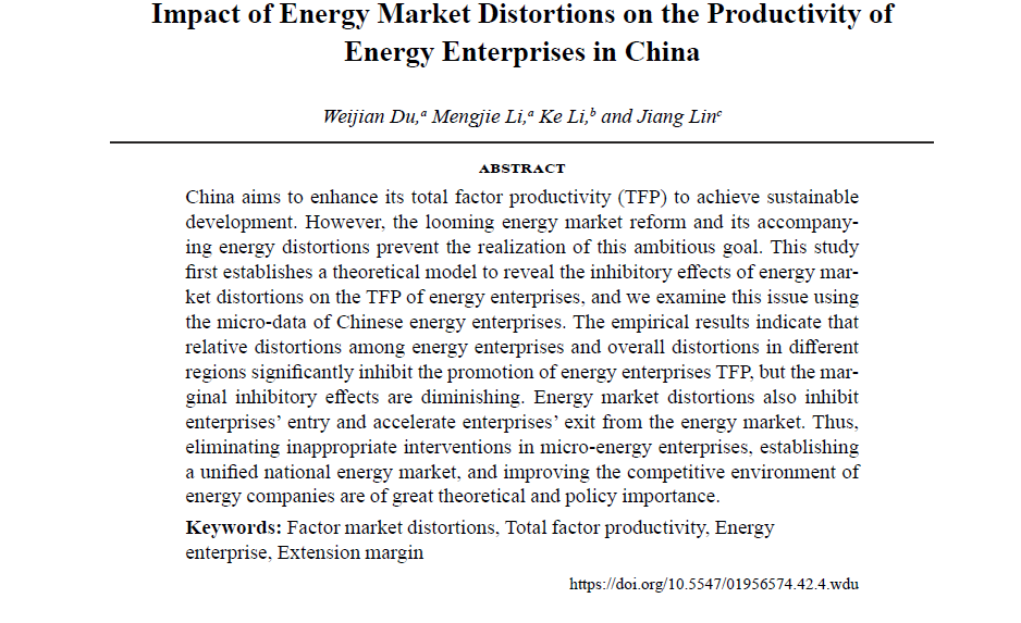 近日,能源经济期刊《Energy Journal》发表山东工商学院万搏在线一篇财富管理研究论文,标题为“Impact of Energy Market Distortions on the Productivity ofEnergy Enterprises in China”。万搏在线杜威剑教授为第一作者,学校为第一完成单位。