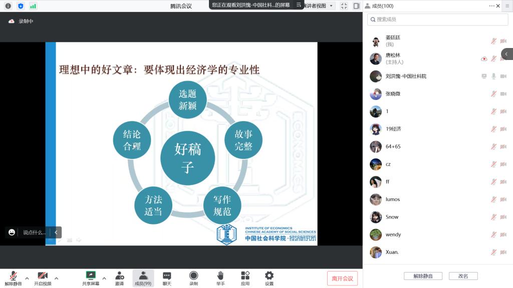 刘洪愧副研究员结合自身工作经验从文章主题、逻辑、研究范式及创新点提炼等方面指出了文章投稿过程中需要注意的问题。他认为理想中的好文章要能够体现经济学的专业性,其中,选题新颖、故事完整、写作规范、论述方法得当以及结论合理缺一不可。会上,刘洪愧副研究员还与学院师生互动,就经济学文章写作与投稿的相关内容进行了深入交流。