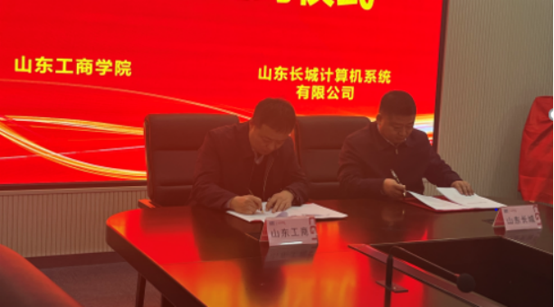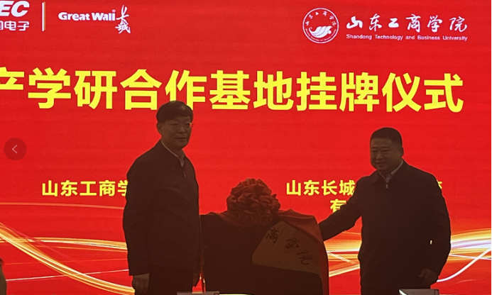 山东长城执行董事黄剑与山东工商学院党委委员、副校长刘冰代表双方为“产学研合作基地”揭牌。