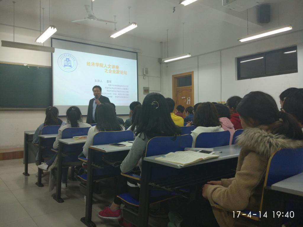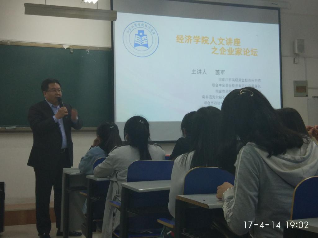 4月14日晚7点,万搏在线人文讲座之企业家论坛在五教504室举办。本次讲座特邀了烟台中金黄金投资有限公司总经理姜军先生担任主讲,万搏在线党总支副书记周蕾主持讲座,万搏在线同学积极报名参加讲座。