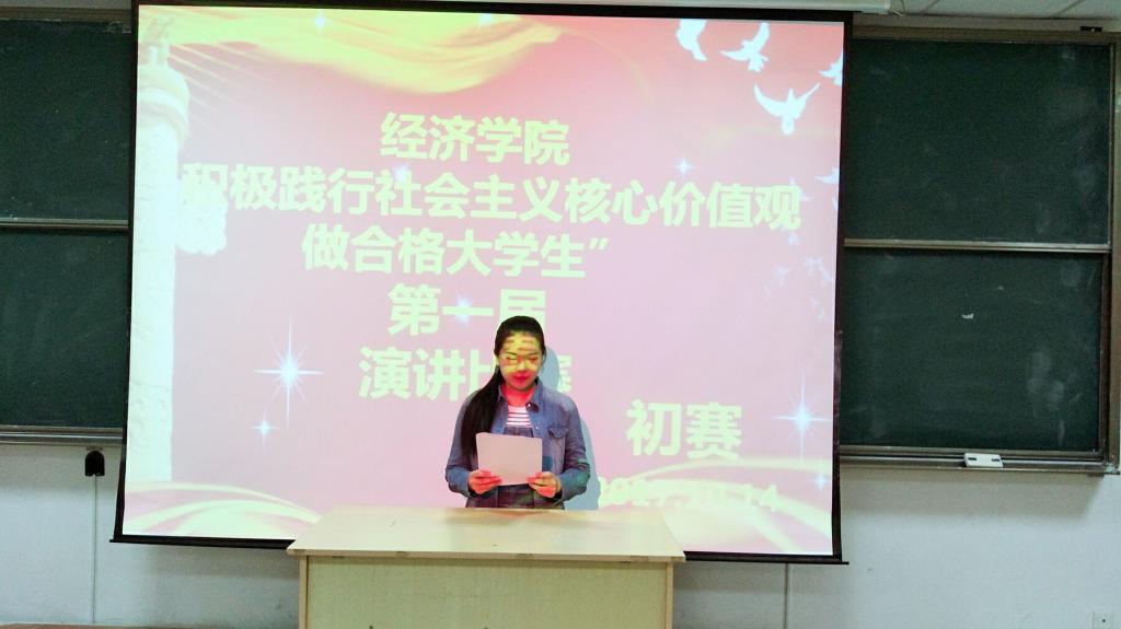 经过主持人简短的赛制介绍,比赛正式开始。参赛选手依次上台演讲,在他们的演讲中,围绕“践行社会主义核心价值观”发表了自己独到的见解。以震撼心灵的声音告知我们应当高度重视自我修养,珍惜来之不易的今天,更要积极地践行社会主义核心价值观,做一名合格的大学生。