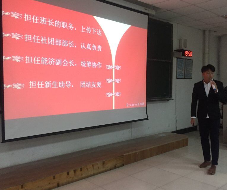 首先由九名竞选同学进行竞选演讲,他们以PPT的形式,讲演结合,先是为大家展示了过去的工作成果以及工作情况,深刻总结了工作中出现的失误,并提出了新的解决方法,接着向大家说明了自己的工作展望,阐述了许多新想法、新方法,明确了自己的信心及热情,带动了同学们的情绪。然后由于向科老师及第十五届学生会主席团进行评分,最后由在场的学生会成员们投票,随着一张张选票单投进箱子中,此次竞选演讲圆满结束。