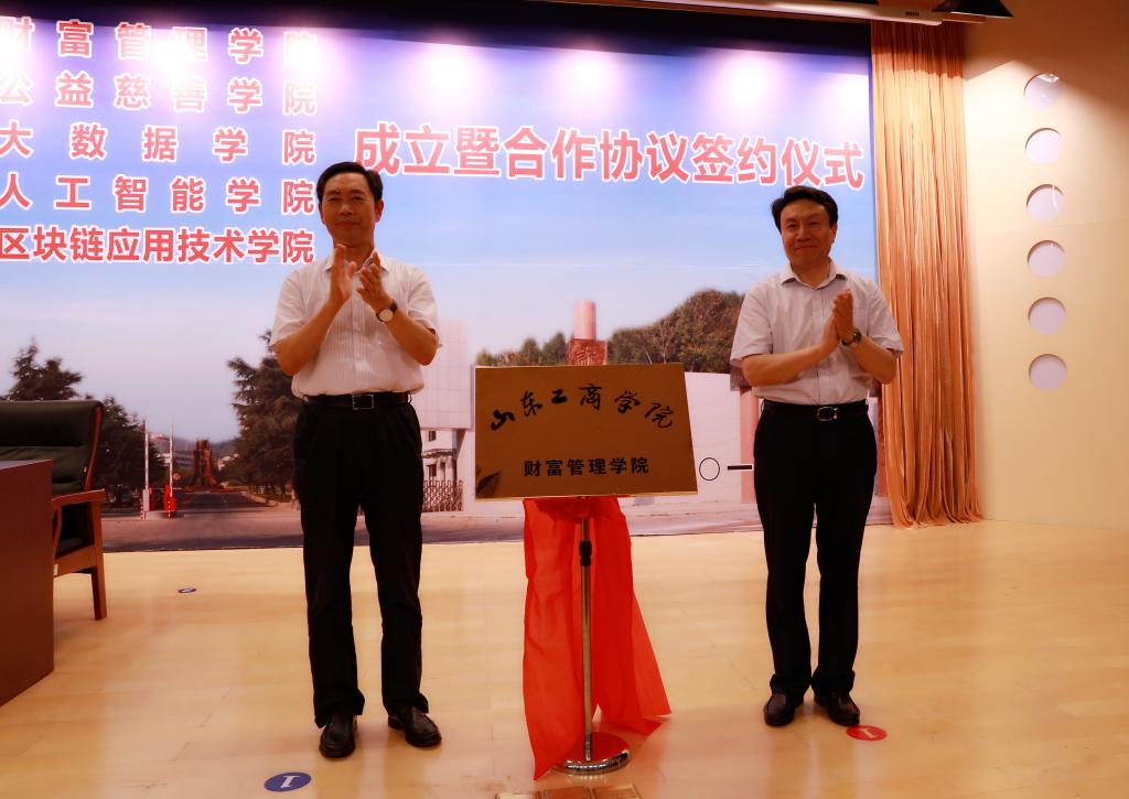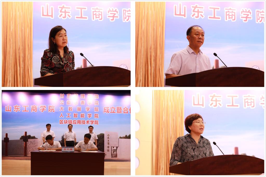 为进一步服务山东省新旧动能转换重大工程,不断推进我校有特色开放式高水平发展,7月14日上午,山东工商学院财富管理学院、公益慈善学院、大数据学院、人工智能学院、区块链应用技术学院成立暨合作协议签约仪式在学术会堂隆重举行。烟台市副市长金志海,深圳国际公益学院副总监包旭日,中科烟台大数据研究院院长董诚,山东浪潮优派科技教育有限公司总裁邵长臣,中国金融博物馆(集团)理事、财务部总监高新应邀出席并为新成立的学院揭牌,中国金融博物馆(集团)培训部总监尹平,烟台市政府副秘书长赵晓峰,烟台市教育工委副书记徐丽珍,校领导白光昭、杨同毅、郭金创、马东太、徐世艾、王艳明、刘向锋出席会议。会议由党委副书记郭金创主持。