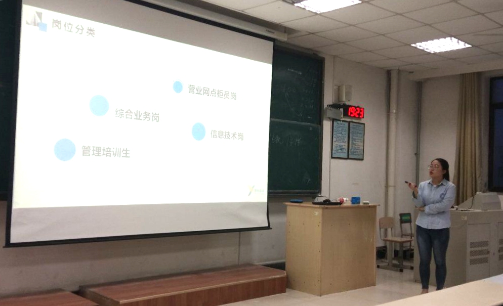 吴老师就暑期银行的报名实习途径、报名流程、实习岗位等方面进行充分讲解,让同学们对银行的招聘计划有了明确的认知。他通过列举四大银行的总体业务、发展战略、人才培养模式,丰富同学们的银行知识结构,以便同学们充分了解就业市场,根据当前的就业形势,针对性的完善自己,不断提升自己的职业素养。