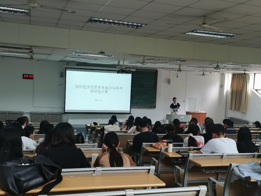 5月21日下午,国际经济与贸易系在2209举办2024年考研经验分享交流会。产业经济学研究生宫玉玺、张高和国际经济与贸易专业2024届毕业生孙赫、张家甜、刘长昊、潘登、王子涵、杨艳、王茗立等同学先后就考研计划时间安排、复习方法、学校选择、复试、调剂、考研辅导班选择以及海外留学和优质岗位实习机会申请等方面进行了经验分享,并与2021级同学进行了交流讨论。